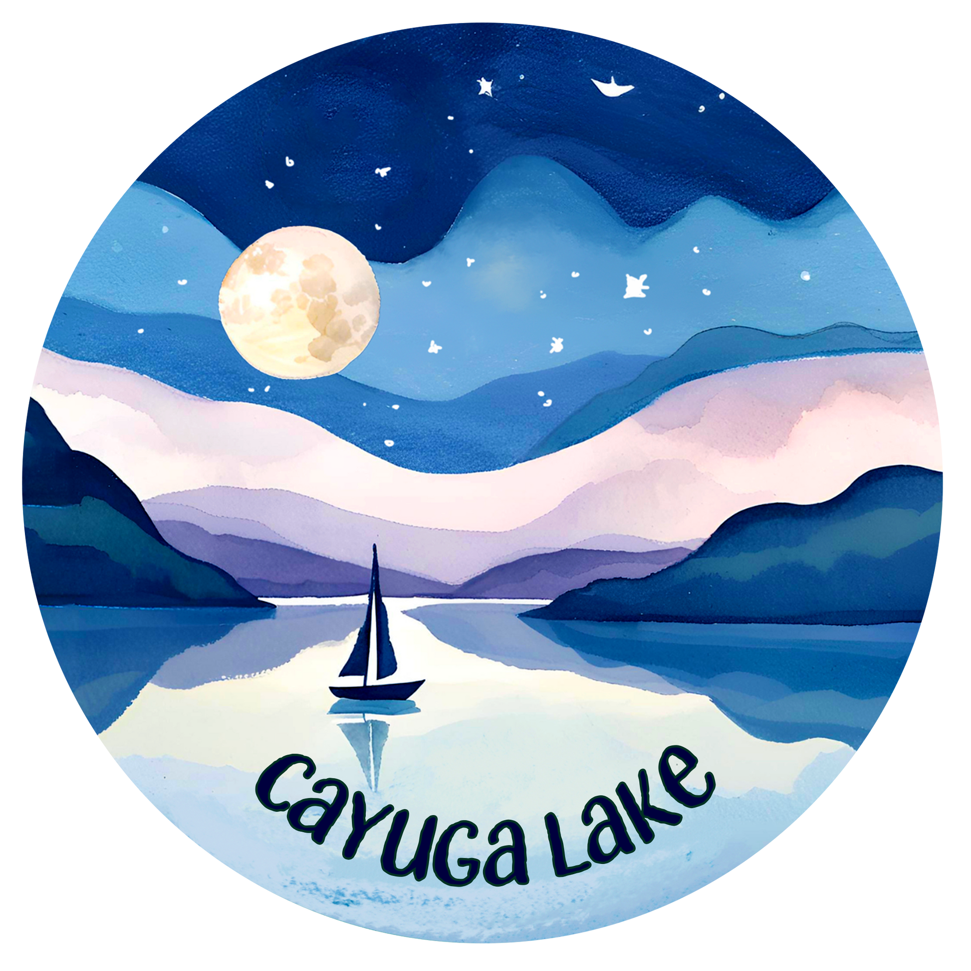 Capture the peaceful beauty of Cayuga Lake with this ceramic ornament, featuring a dreamy watercolor painting of a sailboat gliding across calm waters under a full moon and starry sky. Inspired by the quiet magic of nighttime on the lake, this 3" round ornament brings a sense of serenity and nostalgia to your holiday decor.