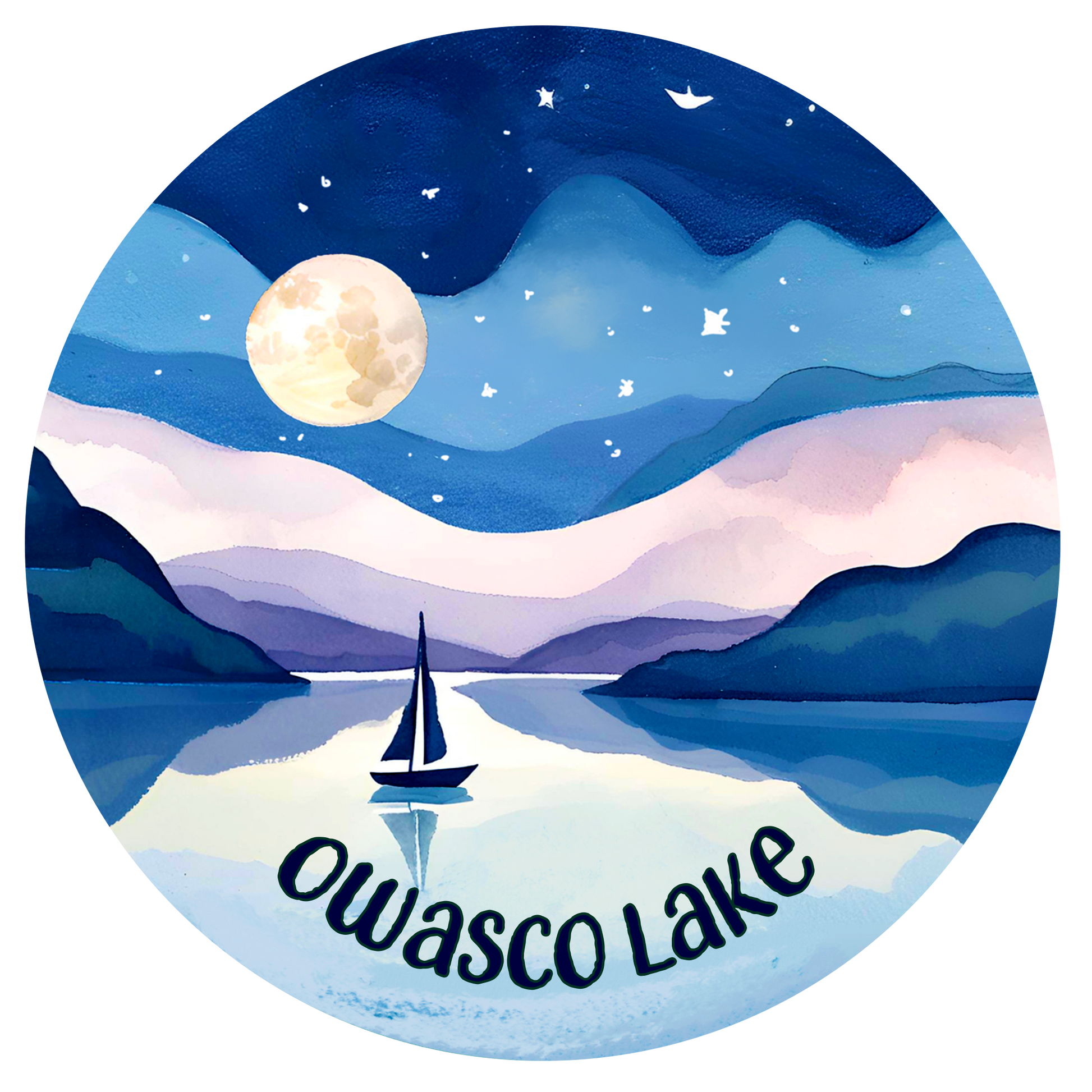 Capture the peaceful beauty of Owasco Lake with this ceramic ornament, featuring a dreamy watercolor painting of a sailboat gliding across calm waters under a full moon and starry sky. Inspired by the quiet magic of nighttime on the lake, this 3" round ornament brings a sense of serenity and nostalgia to your holiday decor.