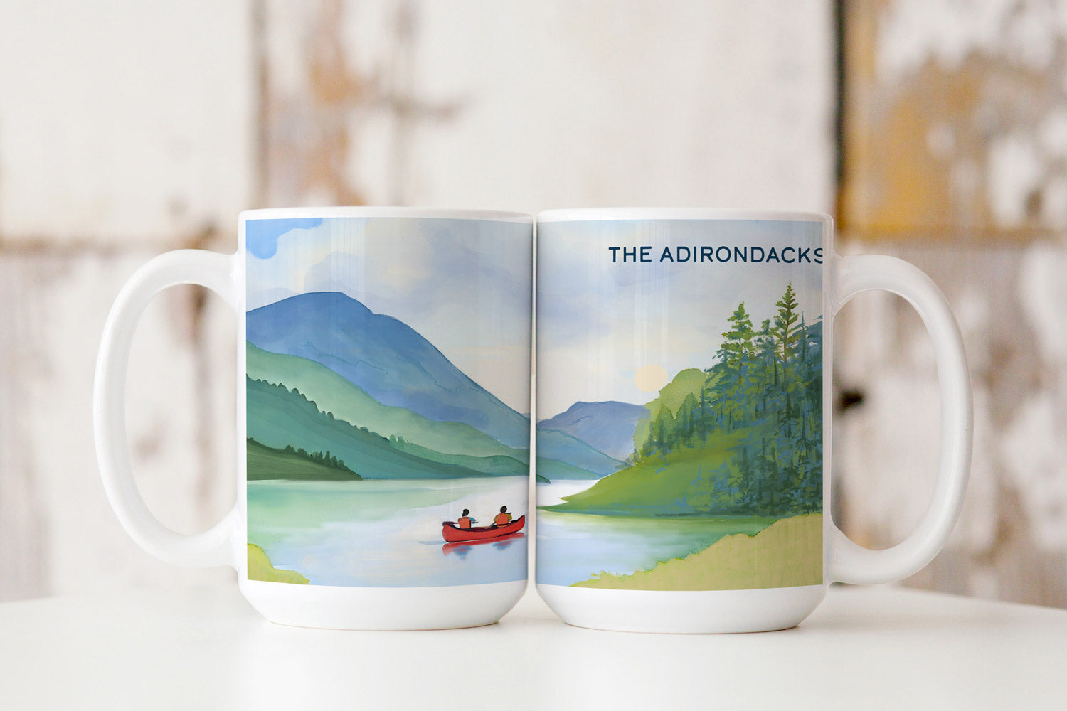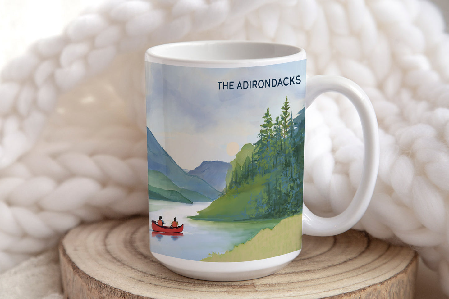 Sip your favorite drink while embracing the gentle beauty of the Adirondacks with this hand-painted 15oz ceramic mug, featuring a couple in a red canoe, surrounded by majestic mountains. This touching scene is a meaningful keepsake for nature lovers.