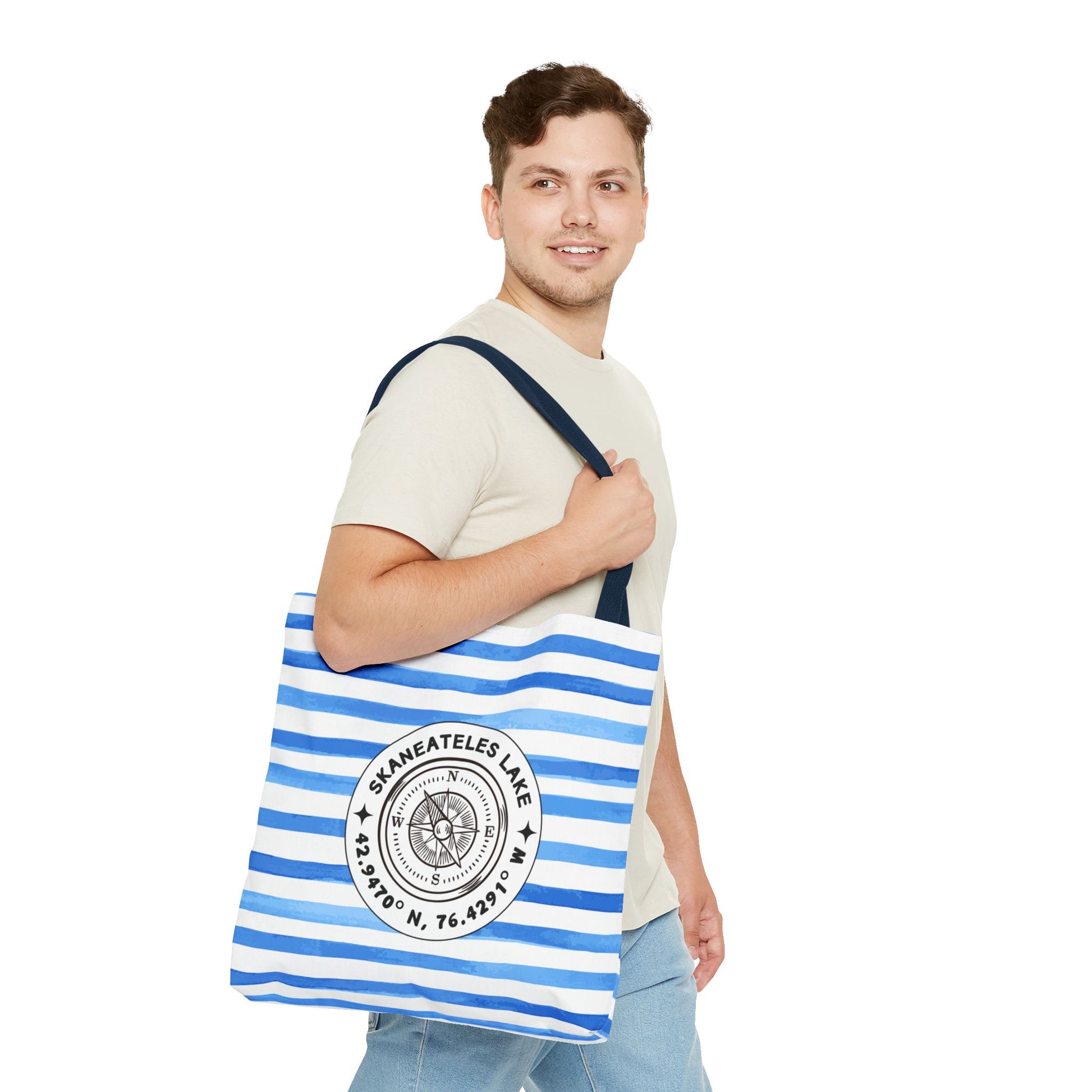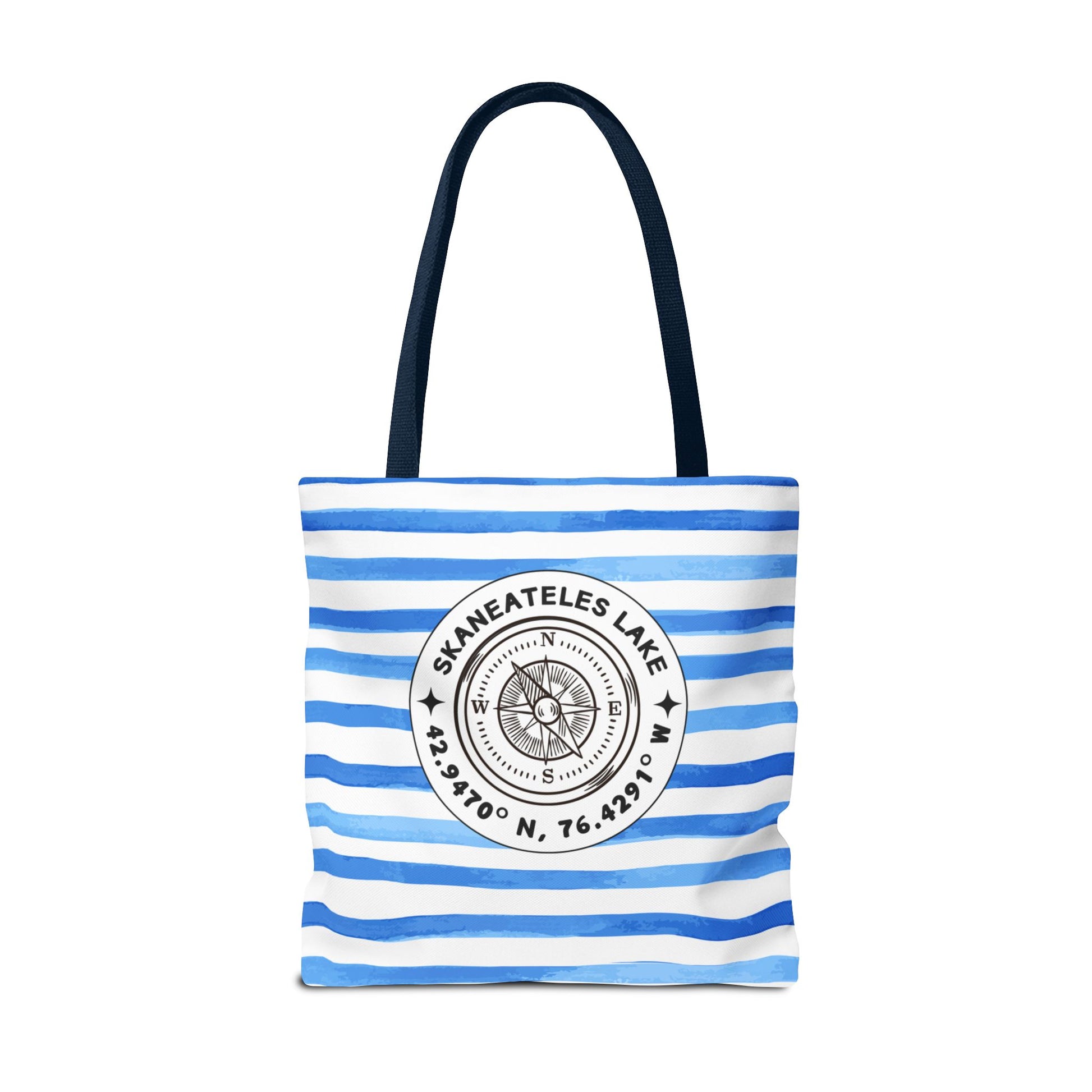 Skaneateles NY Compass, Blue Cabana Stripe, XL Tote Bag